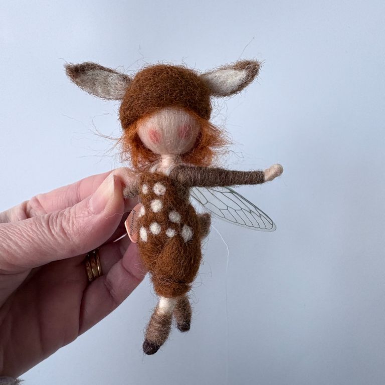 She has a sweet deer face with little ears, delicate fairy wings and a cute forest-style outfit